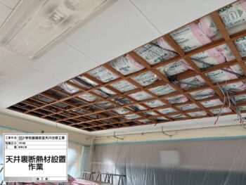天井裏断熱材設置工事② 前回に続き、2校目の天井裏断熱材設置工事を行いました。 断熱材をしっかりと敷き詰めることで、夏の暑さ・冬の寒さをやわらげる効果が期待できます。 また冷暖房効率も向上し、省エネや光熱費削減にもつながります! 学校という多くの方が利用される建物では、快適な環境づくりがとても大切です。 施工前 養生・撤去作業 断熱材設置前 断熱材設置作業 天井材取付作業 天井塗装工事 工事完了 使用材料 住宅・教育施設をはじめとした建築物に幅広く使用されている高性能グラスウール断熱材「マットエース」を採用いたしました。 工事完了 杉本建装工業では、外壁や屋根の塗装だけでなく、今回のような断熱工事や改修工事にも幅広く対応しています! 建物の使い方や環境に合わせてご提案し、丁寧な施工で快適な空間づくりをお手伝いさせていただきます。 これからも、地域のみなさまに「頼んでよかった」と思っていただけるように、一つひとつの工事に真心を込めて取り組んでまいります。 〒593-8312 大阪府堺市西区草部818-3 外壁修繕の窓口:株式会社 杉本建装工業 TEL:0120-71-7716 営業時間 9:00~18:00 (年中無休) 戸建・マンション・アパートの塗装はもちろん、 リフォーム・雨漏り・ベランダ防水・屋上防水・屋根・壁など お困り事がございましたらどんなことでもお気軽にご相談下さい。 <大阪府全域エリア対象> 大阪市・堺市・和泉市・高石市・岸和田市 泉南市・貝塚市・泉佐野市・阪南市・松原市 羽曳野市・藤井寺市・富田林市・大阪狭山市・河内長野市 東大阪市・八尾市・柏原市、全域対象 2025年9月22日 更新
